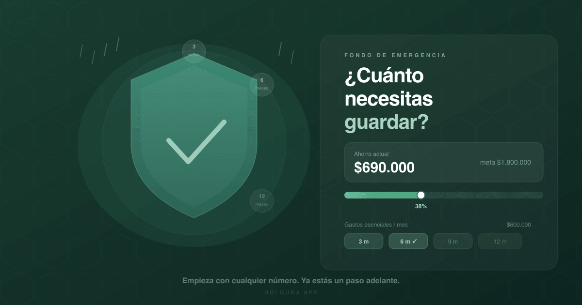 En Holgura puedes crear una meta de fondo de emergencia, ver tu avance en tiempo real y calcular cuánto tiempo te falta para llegar. El coach Holgado puede analizar tu presupuesto actual y decirte concretamente cuánto podrías aportar cada mes sin descuidar tus gastos esenciales ni tus deudas.