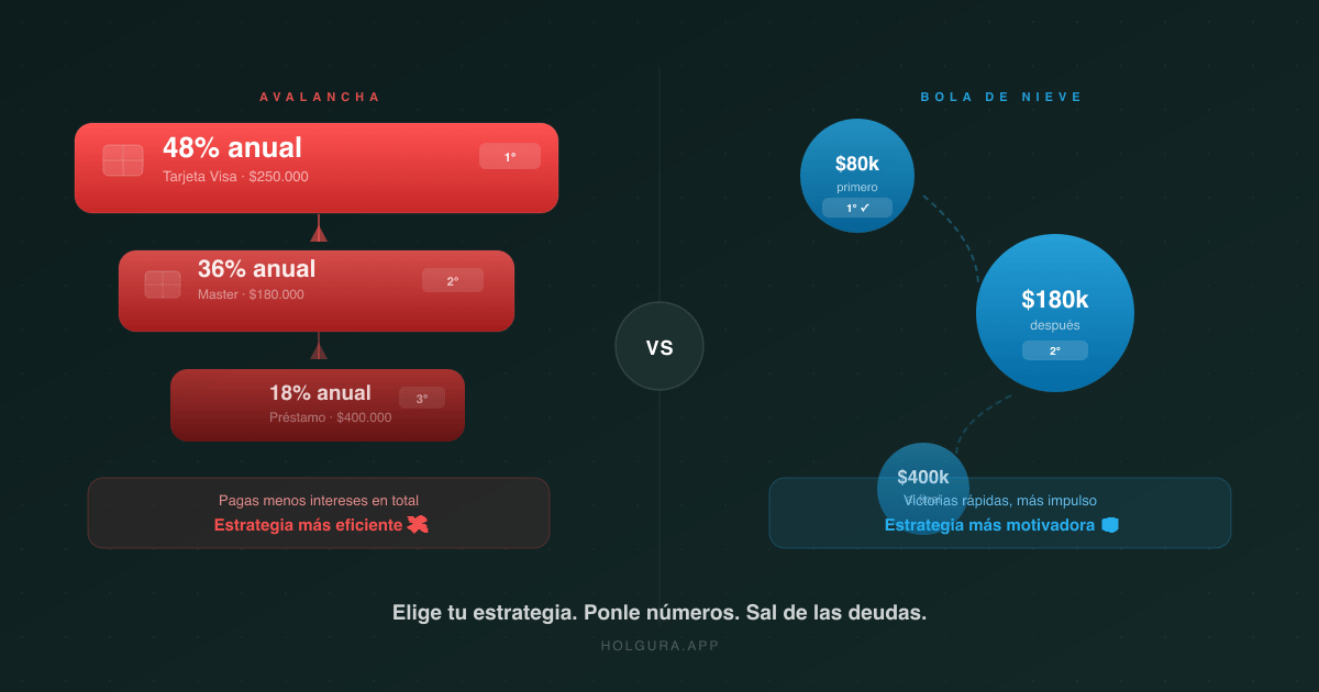 Con avalancha atacas primero la Visa (48%), luego la Master (36%), y al final el préstamo (18%). Matemáticamente es el orden que minimiza el total de intereses pagados.